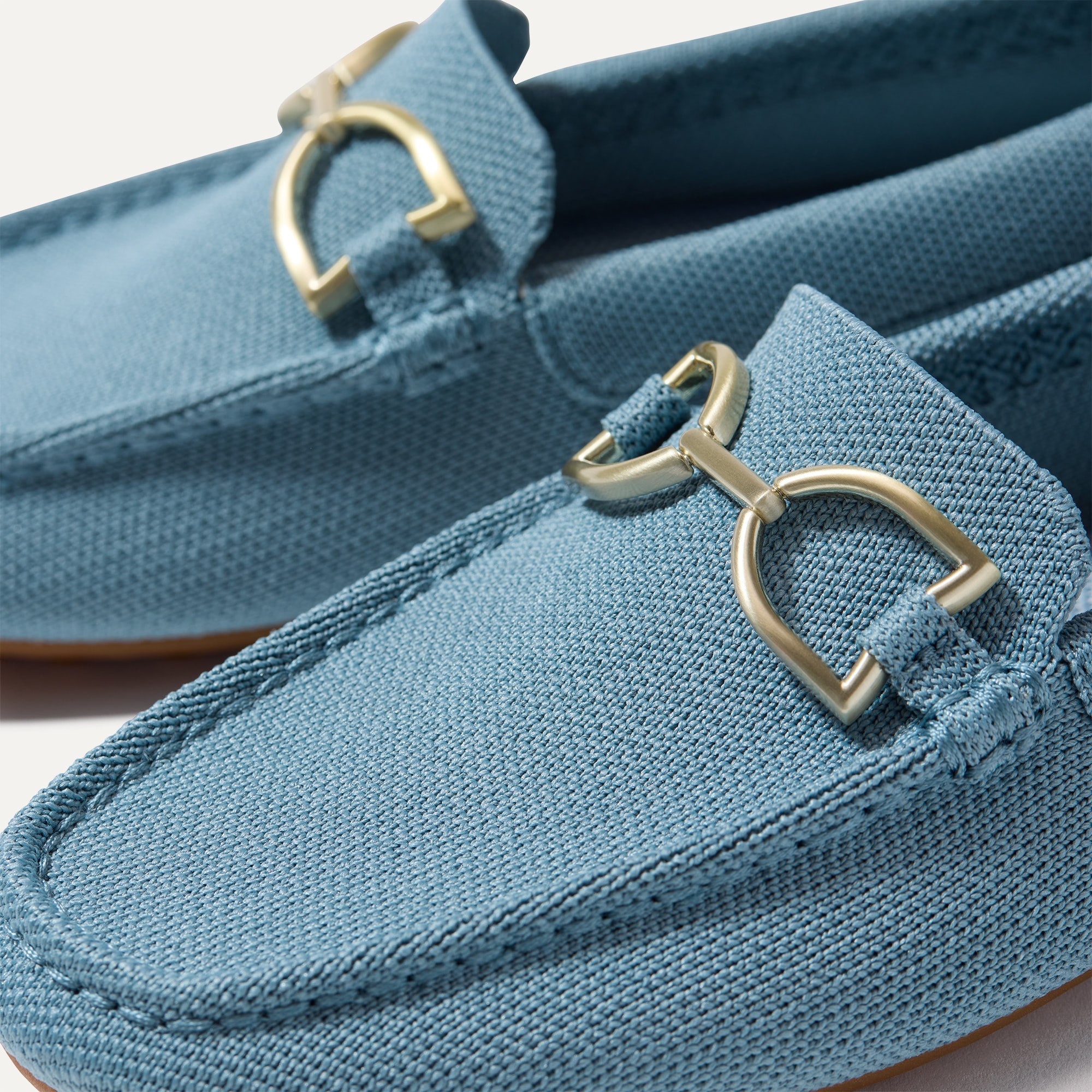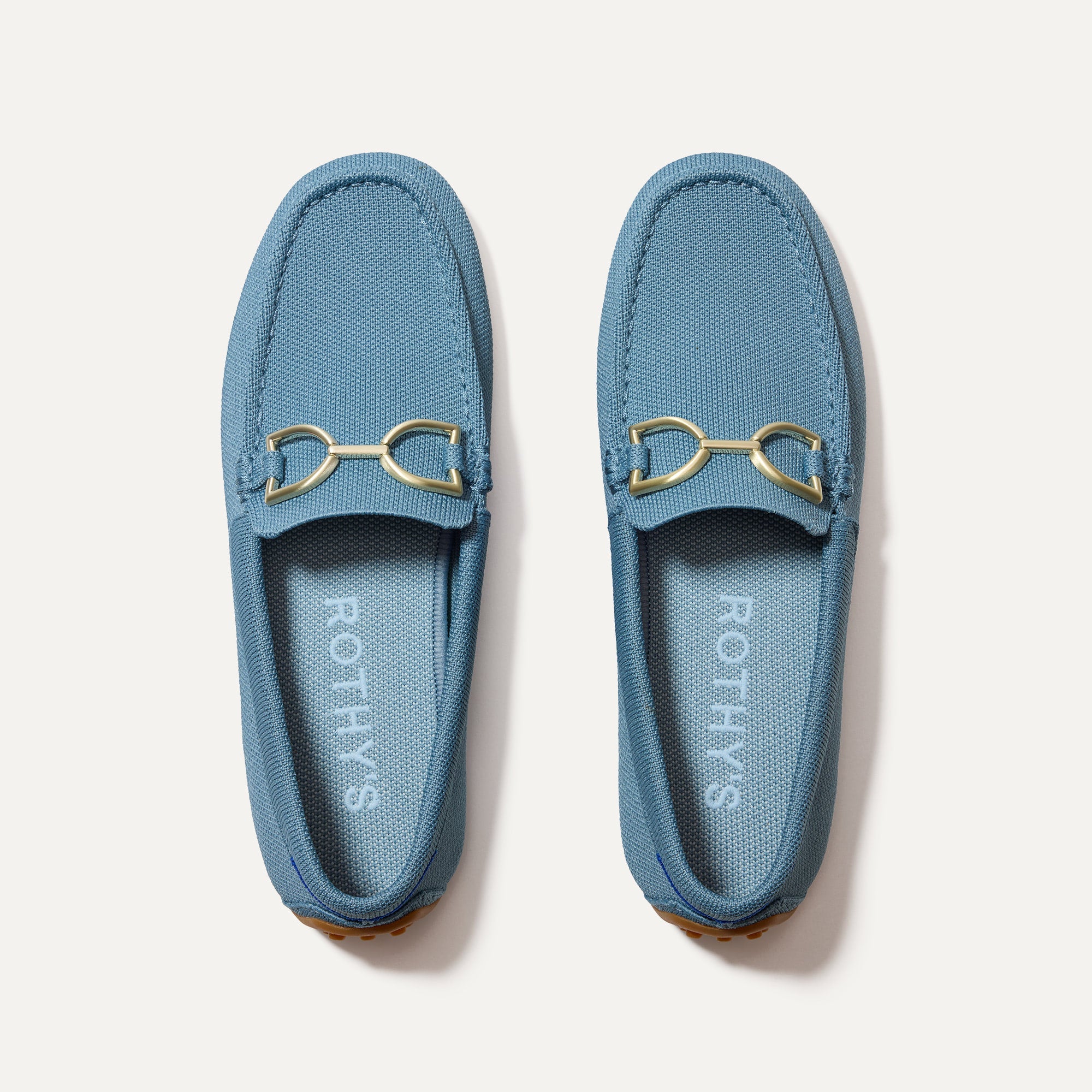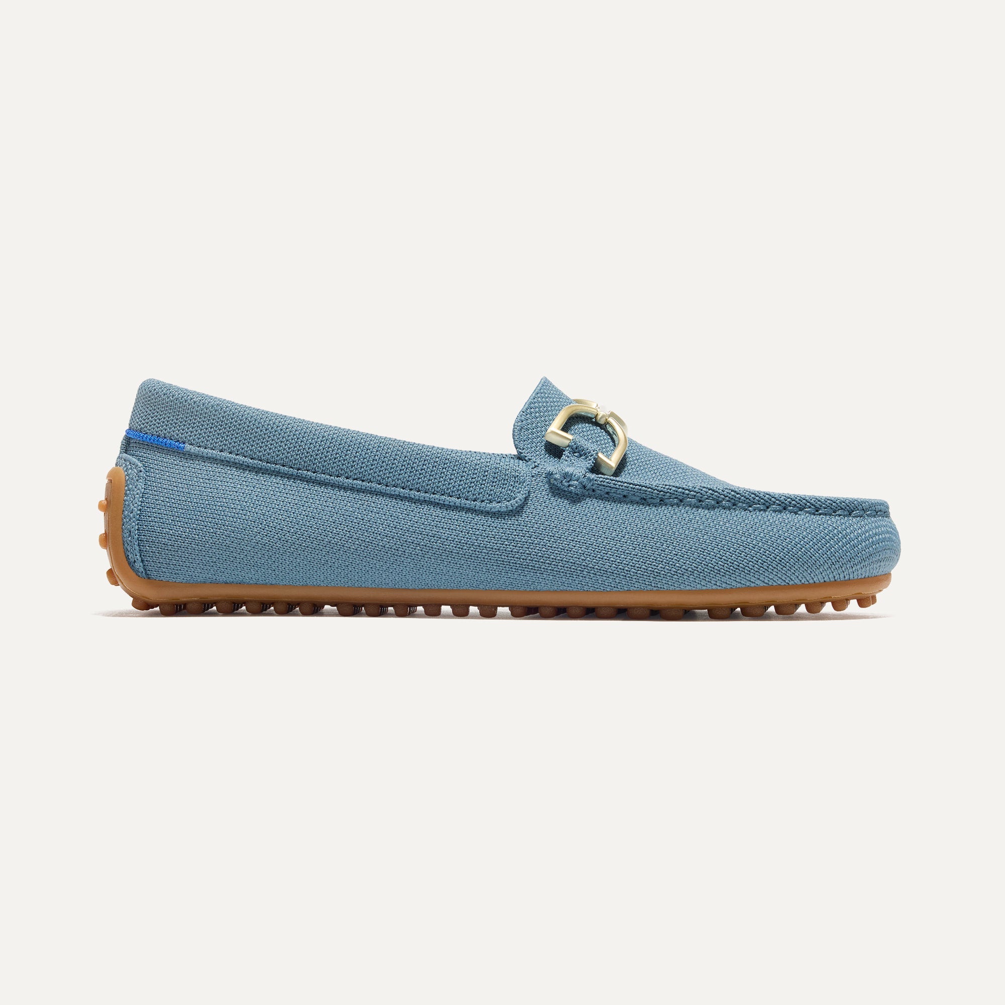 • Soft. flexible upper in sky blue with a gold hardware signet bit on the vamp.