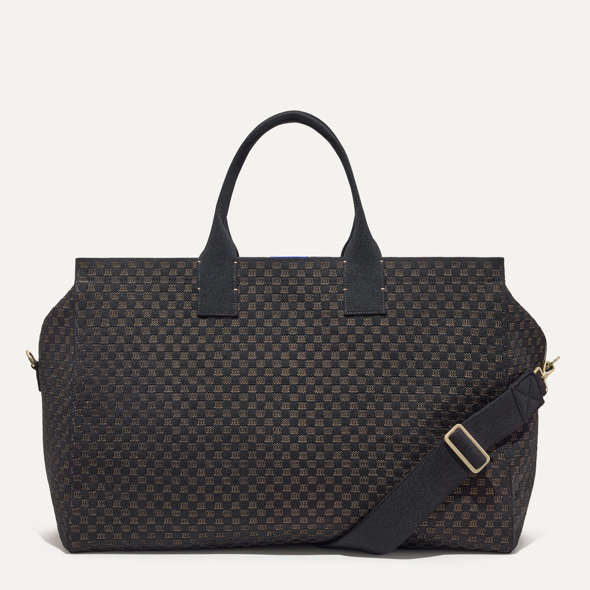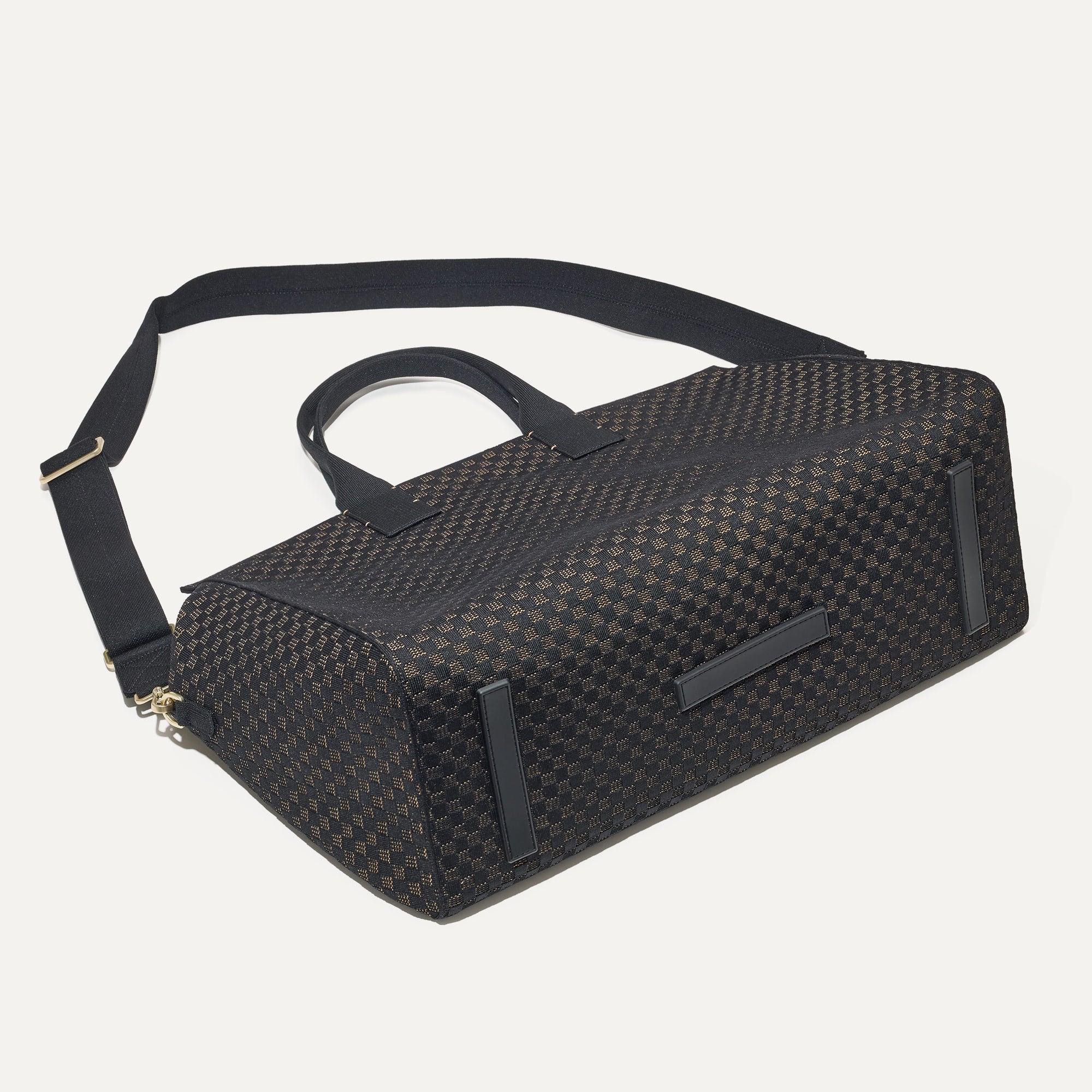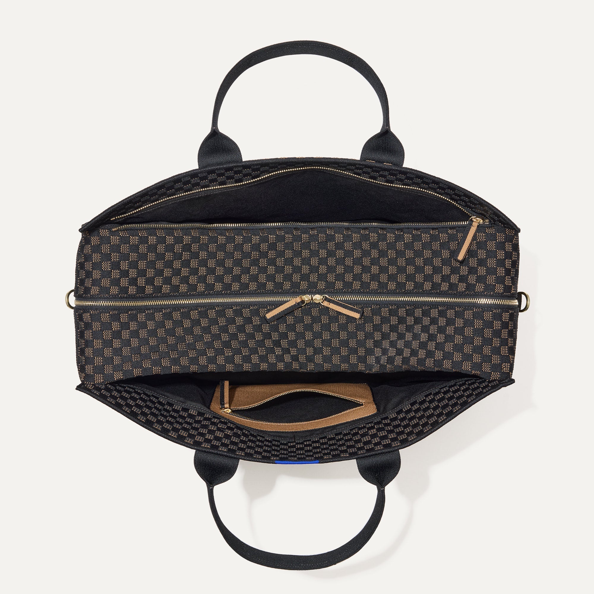 • Structured design in a black and camel basketweave pattern. with a double-zipper top closure and durable bag feet.